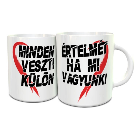 Páros bögre, Minden értelmét veszti, ha mi külön vagyunk felirattal. Kössétek még szorosabbra kapcsolatotokat, tudassátok a kívülállókkal, hogy összetartoztok. A minta színét és a bögre típusát is te választhatod ki. Évforduló alkalmából, vagy Valentin