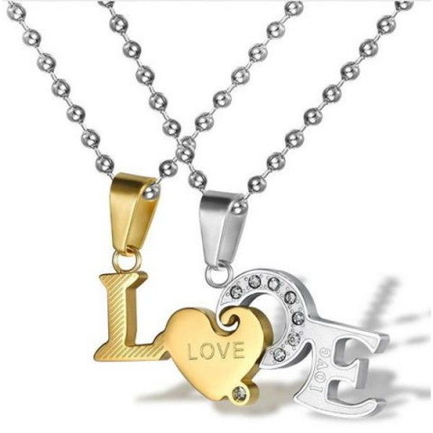 Elegáns páros ezüst nyaklánc ezüst és arany színben, LOVE felirattal. Kifejezi az összetartozást, tökéletes ajándék szerelmeseknek