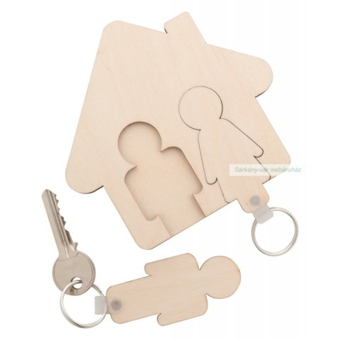 Házalakú fali kulcstartó, melyből kiemelhető egy férfi és egy női alak Mérete: 120 x 150 x 12 mm Rendelésre: 5-10 nap!! Rétegelt nyírfából készült Emblémázás: Gravírozás (E1) Max. színszám: No colour Max. méret: 40mm x 20mm Tampon nyomás (P2) Ma