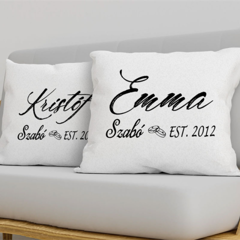 Páros párna évfordulóra, neves ajándék. Névre szóló párna nászajándékba vagy házassági évfordulóra. Személyre szabható egyedi adatokkal, esküvői dátummal és nevekkel, ami az összetartozásotokat jelképezi. A feltüntetett ár tartalmaz 2db párnát nyomat