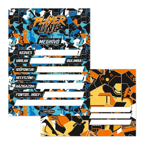 Partimeghívó ARS UNA 10 ív+10 db boríték Player One 10 db különböző alkalomra használható partimeghívó lap és 10 db C/6 méretű, hozzáillő mintájú boríték egy csomagban. 80 gr-os, szép fehér ofszet papírra, négy szín nyomással készült. Golyóstollal és f