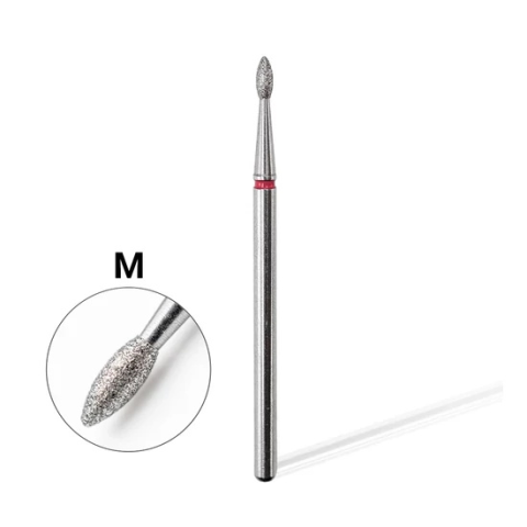 Vékony csepp alakú, közepes erősségű gyémánt csiszolófej gépi manikűrözéshez. Mérete: Ø3 x 4mm