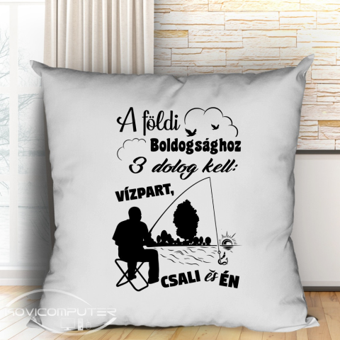 Horgász ajándék, földi boldogság párna megszállott horgászoknak, az alábbi felirattal: A földi boldogsághoz 3 dolog kell: vízpart, csali és én. Lepd meg vele családtagodat vagy barátodat, ha az élete része a horgászat. Válaszd többféle színben. A párna