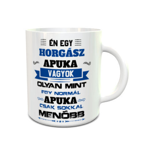 Pecás bögre, menő horgász apuka. Én egy horgász apuka vagyok, olyan mint egy normál apuka, csak sokkal menőbb feliratos bögre. Ajándék apáknak, akinek az élete a halak és szabadidejében, ha teheti horgászik. Lepd meg vele születésnapján vagy névnapján, hi