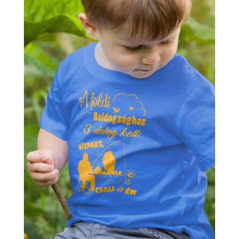 Horgász ajándék, földi boldogság gyerek póló megszállott horgászoknak, az alábbi felirattal: A földi boldogsághoz 3 dolog kell: vízpart, csali és én. Lepd meg vele családtagodat vagy barátodat, ha az élete része a horgászat. Válaszd többféle színben és mé