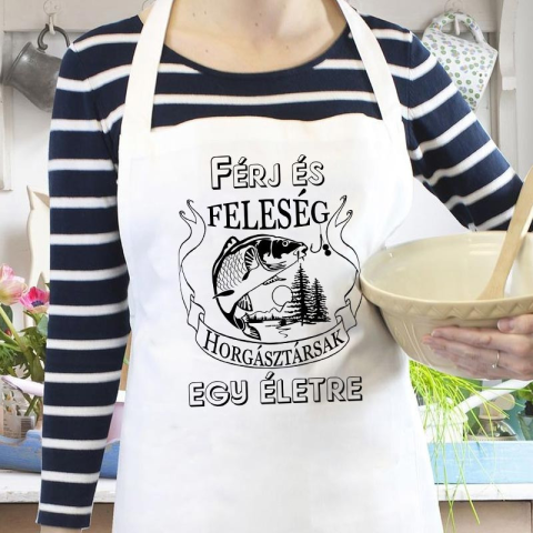 Kötény házasoknak, horgásztársak egy életre. Pecás kötény férjnek vagy feleségnek akiknek mindeketten szenvedélyes horgászok, fekete vagy fehér színű kötényre. Rendelj páros kötényt házasoknak, anyaga vászon, mérete: 66x78 cm. Egyedi mintával ellátott