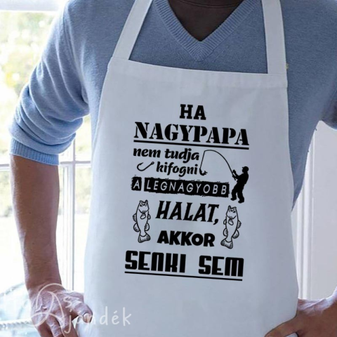 Ajándék horgász nagypapának. Ha nagypapa nem tudja kifogni a legnagyobb halat, akkor senki sem kötény nagyszülőknek. Fehér és fekete színben rendelhető vászon kötény. Praktikus kerti grillezéshez, vagy a konyhában is. Egyedi mintával ellátott kötényün