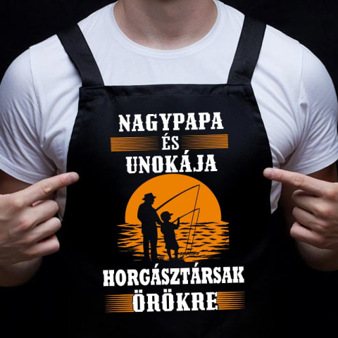 Horgásztársnak kötény, nagypapa és unokája horgásztársak örökké feliratos kötény pecás mintával. Ajándékötlet apák napjára, születésnapra nagypapának és unokájának. Mutassátok meg összetartozásotokat a főzés, grillezés közben is. Anyaga vászon, mérete: