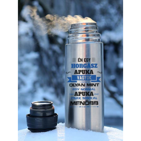 Pecás termosz, menő horgász apuka. Én egy horgász apuka vagyok, olyan mint egy normál apuka, csak sokkal menőbb feliratos termosz. Ajándék apáknak, akinek az élete a halak és szabadidejében, ha teheti horgászik. Lepd meg vele születésnapján vagy névnapján