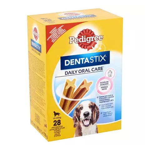 A Pedigree® Napi DentaStix® különleges X-alakú fogápoló pálcika, amelyről tudományosan bizonyították, hogy napi használat esetén akár 80%-kal csökkenti a foglepedék kialakulását. A Pedigree® Napi DentaStix® termékeket úgy tervezték, hogy hosszan kelljen rágni a megfelelő hatékonyság érdekében, így csökkentve a foglepedék és fogkő kialakulását enyhén érdes állagának és aktív hatóanyagainak köszönhetően. Ízletes, alacsony zsírtartalmú, hozzáadott