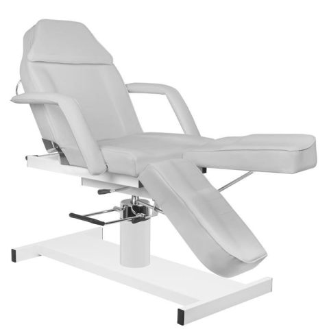 Pedikűrős szék, szürke műbőr kárpittal, hidraulikusan állítható magasítással, manuálisan állítható ülés dőlés szöggel, mechanikusan állítható háttámlával, és osztott lábtartóval. A kivehető fejpárna alatt arckivágás található, mely a masszázsnál nyújt seg