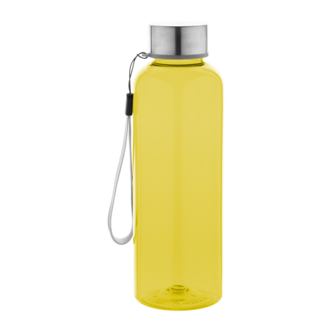 BPA-mentes RPET műanyag kulacs rozsdamentes acél kupakkal és hordszíjjal, 500 ml. Nem alkalmas szénsavas italok tárolására.
