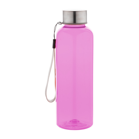 BPA-mentes RPET műanyag kulacs rozsdamentes acél kupakkal és hordszíjjal, 500 ml. Nem alkalmas szénsavas italok tárolására.
