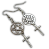 Ez az ezüst színű pentagrammás kereszt fülbevaló misztikus és elegáns kiegészítő. 5 cm hosszú, beakasztós kialakítással, fémötvözetből készült