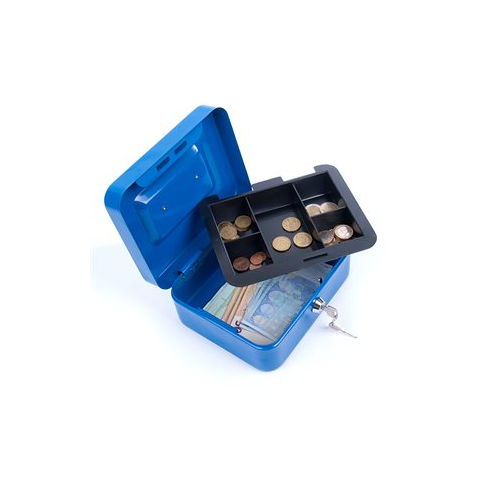 Pénzkazetta az értéktárgyak, érmék és bankjegyek biztonságos tárolására és szállítására, hordozófüllel. Belső műanyag tálcával, cilinderzárral, 2 kulccsal. Kék színben. 2016. április 02.-tól az online pénztárgéppel rendelkező vállalkozásoknak a jogszabály