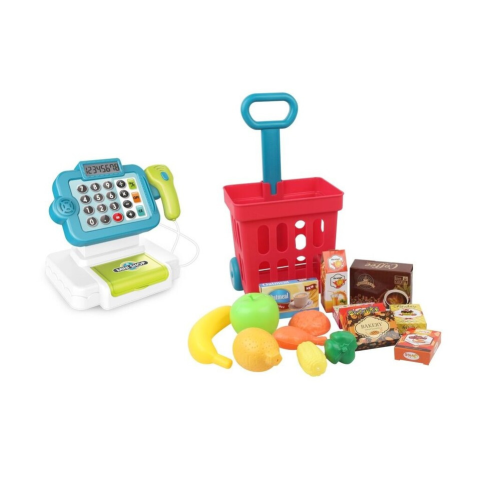 A készlet a pénztárgépen kívül tartalmaz egy bevásárlókocsit élelmiszerekkel
