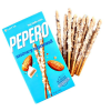 Pepero Snowy Almond fehércsoki és mandula ízű ropi. töltőtömeg: 32g Összetevők: csokoládé bevonat 49% [cukor, pálmaolaj, napraforgóolaj, emulgeálószer (E322 - szója, E476), antioxidáns (E306), laktóz (tej), kevert tejpor, kakaóvaj, mesterséges aroma