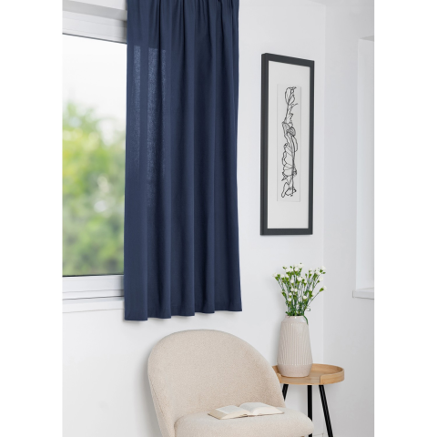 Percy/03, kék színű, minta nélküli dekor készfüggöny, ráncolószalaggal. Mérete 140 cm x 175 cm. Alapanyaga 100 % pamut.