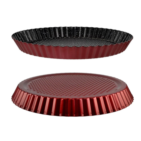 Perfect Home Metal Red Line gyümölcstorta forma 27 cm 19118 Perfect Home Metal Red Line gyümölcstorta forma 27 cm 19118 Anyaga: tapadásmentes bevonattal ellátott acél Mérete: ~27 cm átmérő; ~3 cm magas; Súlya: 240 g Tisztítása: Mosogatógépben mosható,