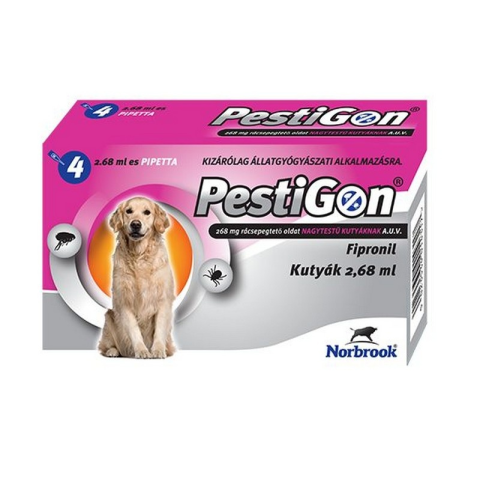 Pestigon spot on L 20-40 kg 4x Hatóanyag: Fipronil 50 mg/egy 0,5 ml-es pipetta tartalma Fipronil 67 mg/egy 0,67 ml-es pipetta tartalma Fipronil 134 mg/egy 1,34 ml-es pipetta tartalma Fipronil 268 mg/egy 2,68 ml-es pipetta tartalma Fipronil 402 mg/egy 4