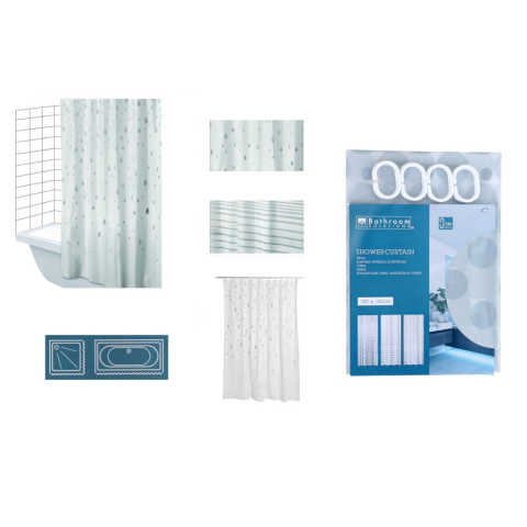 CY2100930 A függöny 100% PEVA anyagból készült, amely vízálló, penész és szakadásálló. Kis szemek és fehér függőgyűrűk vannak benne. A fehér függönyt vízszintes csíkok díszítik. A teljes zuhanyfüggöny méretei szélessége 180 cm hossza 180 cm vastagsága 0,6
