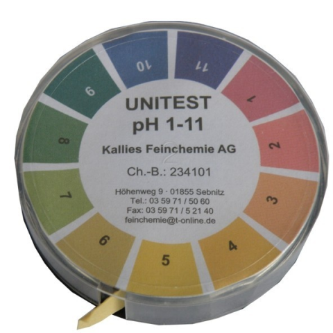 Termék jellemzői: - 1-11 tartomány mutató pH teszt - 5 m hosszú téphető - vizes oldatokhoz - 2 percig kell a vizsgálandó oldatba rakni - színkód alapján történi a leolvasás - 11 lépéses szinkód - csipesszes javasolt megfogni, hogy a kéz pH-ja ne befolyáso