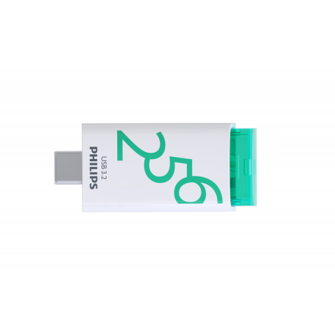 Philips USB 3.2 Gen1 pendrive USB-C csatlakozással, 256 GB tárhellyel. Maximális olvasási sebesség 120 MB/sec, maximális írási sebesség: 50 MB/sec Minden USB-C porttal rendelkező eszközzel használható Az USB-C csatlakozó kényelmes védelme a beépített k