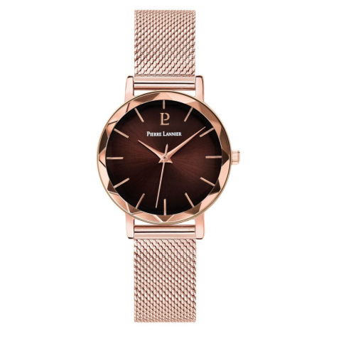 Rozsdamentes acél női karóra. Rozé arany színű PVD bevonatú tok. Sunburst hatású csokoládé barna színű számlap. Rozé arany színű PVD bevonatú mutatók és indexek. Megbízható japán quartz szerkezet. Rozsdamentes acél milánói szíj. Különleges csiszolású ór