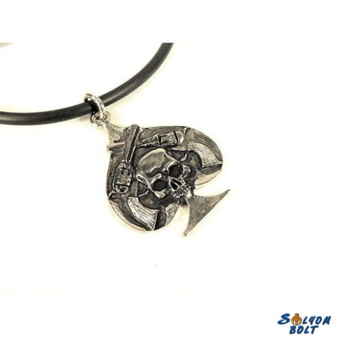 Egy pikk lapban lévő koponya fej 2 pisztollyal. Méret: 3 x 4 cm Anyaga: zamak, nikkelezve
