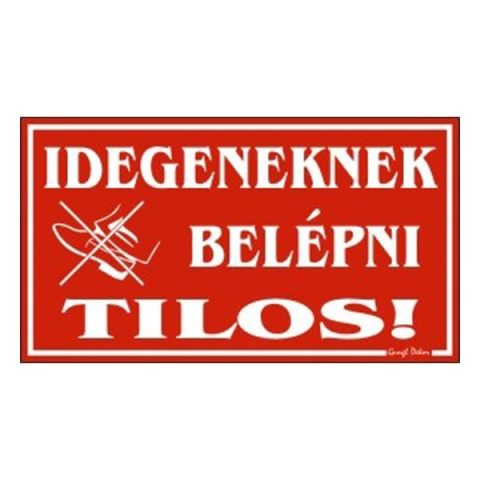 Piktogram Idegeneknek belépni tilos piros Idegeneknek belépni tilos. Mérete: 12,5x22,5 cm. Piros alapon fehér betűk. Hullámos műanyaglemez damil akasztóval.