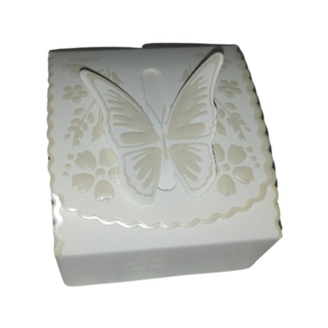 Fehér / bézs színű karton dobozka pillangó alakú kivágással a tetején, dobornyomott virágdszítéssel. Egyedi esküvői dekoráció és ajándéktartó is egyben. A násznépnek szánt apró ajándékok becsomagolásához praktikus doboz. Anyaga: karton Mérete: 75 mm