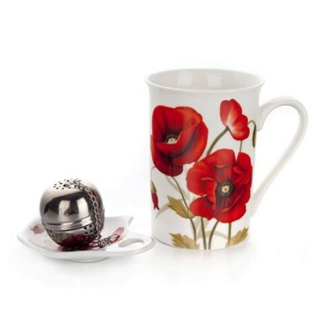 Háromrészes Pipacsos teakészlet, a készlet tartalma: 1x kerámia bögre 340 ml űrtartalommal (magasság 10,8 cm, átmérő 7,6 cm), 1x fémszűrő, 1x tálca a teaszűrő alá.