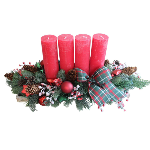 Piros Adventi Gyertyatartó - Kézzel Készített Ünnepi Dekoráció 🎄 Varázsolja el otthonát a tökéletes karácsonyi hangulattal ezzel a kézzel készített piros adventi gyertyatartóval! A fa tálcán elhelyezett gyertyák és a hozzájuk tartozó díszítések meghi...