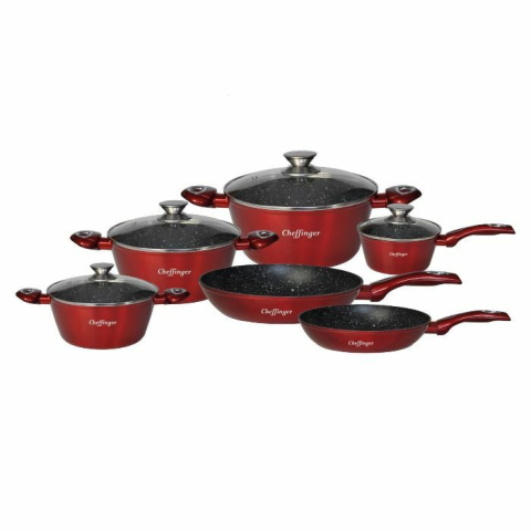 Piros Cheffinger Home edénykészlet 10 részes A Cheffinger 10 részes, tapadásmentes bevonatú edénykészlet stílusos és funkcionális edények és serpenyők kollekciója, amely feldobja a főzési élményt. A készlet többféle méretű és tí