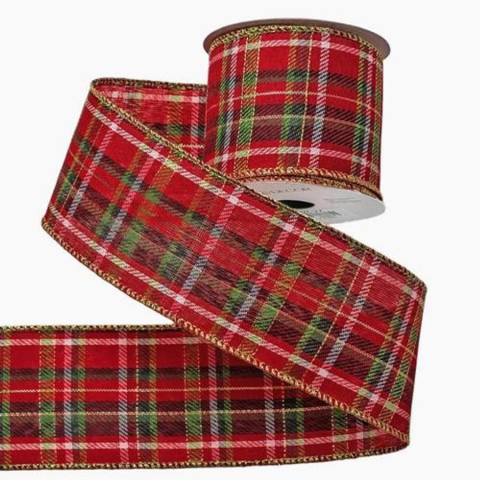 Piros kockás karácsonyi szalag drótos szegéllyel, 64 mm.