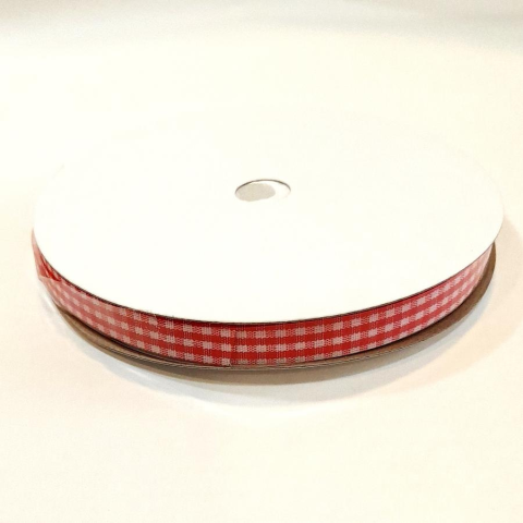 Piros-fehér kockás textil szalag, szélessége 1 cm.