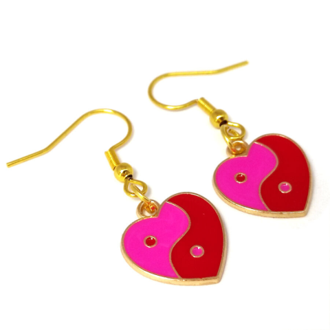 Piros-pink szív jin-jang fülbevaló