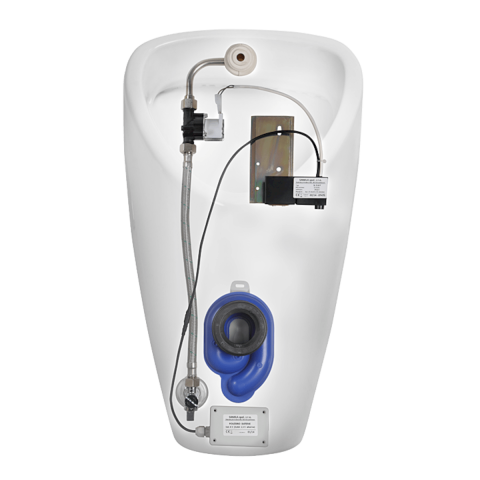 Praktikus kerámia piszoár integrált radarelektronikával akkumulátoros tápellátáshoz a jól ismert SANELA cégtől, mágnesszeleppel, csatlakozó tömlővel, sarokszeleppel, bemeneti csatlakozóval tömítéssel, szifonnal, rögzítőkészlettel, elemtartóval és akkumulátorcsomagokkal 4 db AA alkáli, 1,5V , 1,5 V mAh.