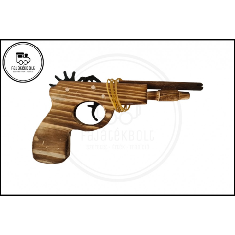 Fa pisztoly A pisztollyal befőttes gumit lehet vele kilőni, akár sorozatban is. A gumit a pisztoly elején található nútba kell beakasztani, a másik végét a forgótárcsába. Ezután a ravaszt meghúzva a gumit kilövi Anyaga: Fa Mérete: Hosszúság: 22,5 cm