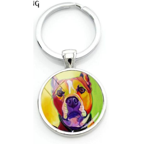 Színes pitbullos kulcstartó fém és üveg anyagból, tökéletes választás pitbull rajongóknak és állatbarátoknak. Egyedi és tartós kiegészít