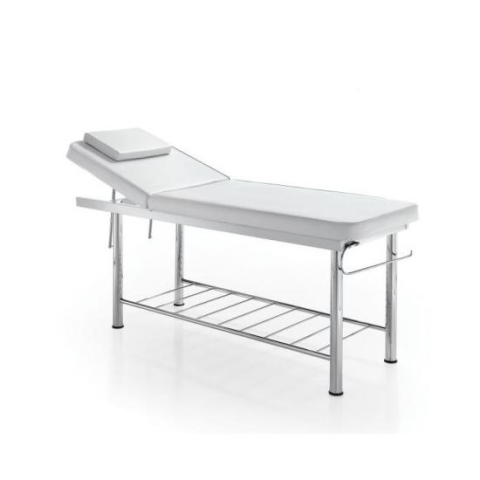 Planet masszázságy, fehér műbőr kárpittal, krómozott vázzal. Ez a masszív acél szekezetű masszázságy állítható háttámlával, törölközőtartó polccal és papír ágytakaró tartóval rendelkezik
