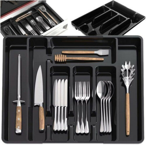 Ruhhy Kihúzható Fekete Műanyag Evőeszköztartó Fiókba 🍽️ Ez a kihúzható evőeszköztartó tökéletes megoldás a konyhai fiók rendszerezésére. A tartó 28 cm-től 45 cm szélességig állítható, így szinte bármilyen fiókba illeszkedik. A csúszásgátló mechanizmus...