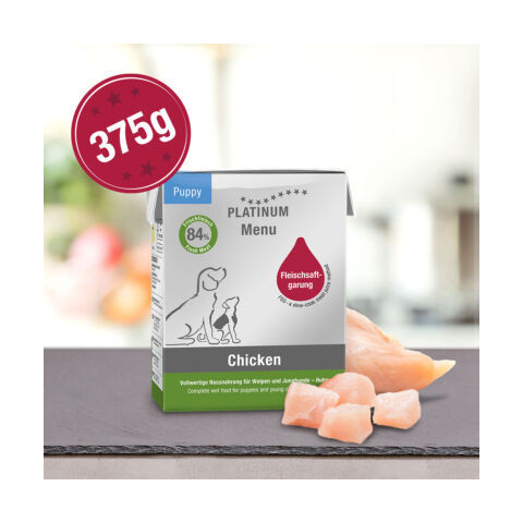 Minimum rendelhető mennyiség: 3 db MENU Puppy Chicken kölyök nedvestáp 84% friss csirkehúsból 375 g Bármely fajtájú és korú kölyök kutya számára. A Platinum kutyatáp -garantáltan friss húsból készül -GMO mentes nem tartalmaz gluténtartalmú összetevő
