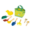 5 színes kerti szerszám: -gereblye -kerek kanál -kislapát -ásó -lapát -állat formájú öntözőkanna -2 növény nyárs fából 3 éves kortól
