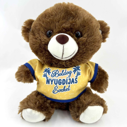 Plüss maci barna és fehér színben, levehető pólóján színes felirattal. 25 cm magas Nagyszerű választás, ha szívhez szóló, egyedi ajándékot szeretnél adni. Ideális ajándék nyugdíjas búcsúztatóra. Utánvétellel nem vásárolható.