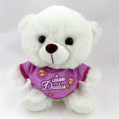Plüss maci barna és fehér színben, levehető pólóján színes felirattal. 25 cm magas Nagyszerű választás, ha szívhez szóló, egyedi ajándékot szeretnél adni. Ideális ajándék dadusoknak, minden alkalomra. Utánvétellel nem vásárolható.