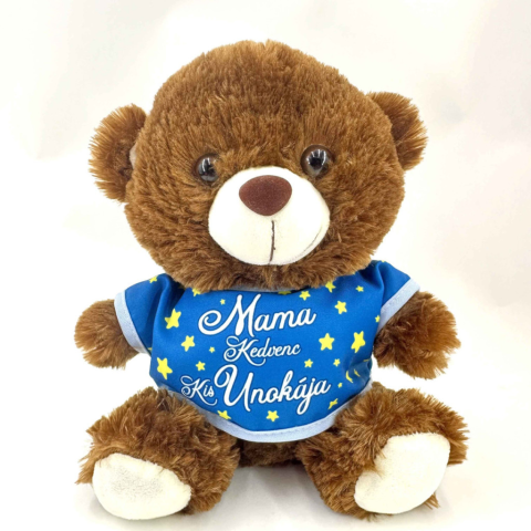Plüss maci barna és fehér színben, levehető pólóján színes felirattal. 25 cm magas Nagyszerű választás, ha szívhez szóló, egyedi ajándékot szeretnél adni. Ideális ajándék unokáknak, minden alkalomra. Utánvétellel nem vásárolható.