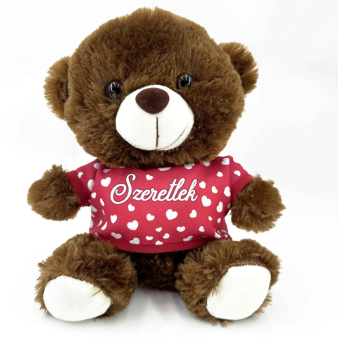 Plüss maci barna és fehér színben, levehető pólóján színes felirattal. 25 cm magas Nagyszerű választás, ha szívhez szóló, egyedi ajándékot szeretnél adni. Ideális ajándék minden alkalomra. Utánvétellel nem vásárolható.
