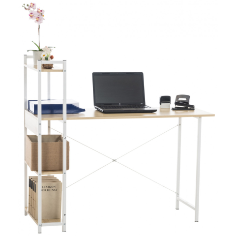 Kiváló minőségű anyagokból készült íróasztal, letisztult forma. Az asztallap MDF-ből készült, és stabilan áll a festett acélcső vázon. Az oldalra erősített polc elegendő tárolóhelyet biztosít dokumentumok, munkaanyagok vagy dekorációk tárolására. A lábak