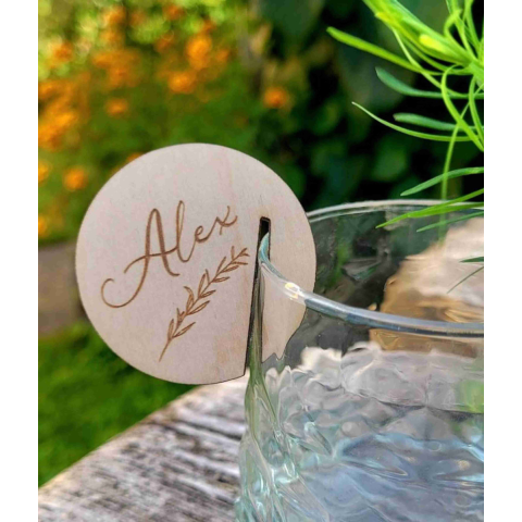 A kerek formájú, pohárra tehető fa ültetőkártya elegáns és praktikus kiegészítője bármilyen esküvői asztaldekorációnak. A természetes fa alapanyag és a lézervágott, személyre szabható név garantálja az egyediséget. Egyszerűen a pohár szélére akasztható, í